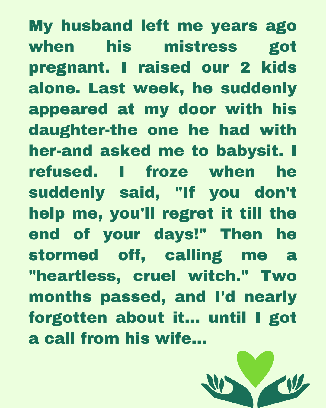 Years ago, my husband left me when his mistress became pregnant. I raised our two children on my own. Then, last week, he unexpectedly showed up at my door with his daughter—the one he had with her—and asked me to babysit.
