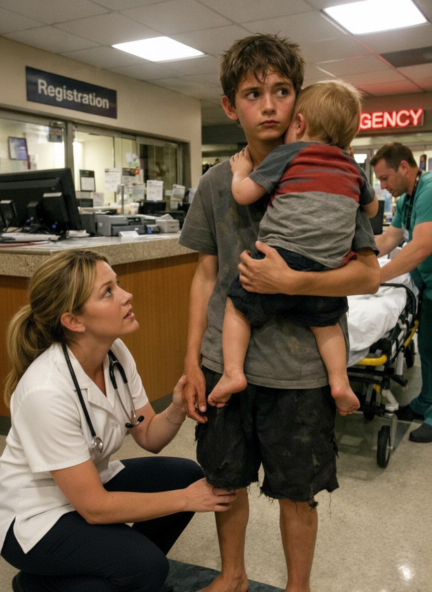 The boy paused just beyond the entrance, blinking beneath the unforgiving fluorescent lights as though he’d crossed into a foreign world. His shoulders were hunched inward, his thin arms wrapped tightly around a toddler pressed against his chest like the last unbroken fragment of a life already splintered too many times. His feet were filthy and scraped raw, dotted with dried blood and grit, yet he seemed unaware of the pain—or of anything at all—except the shallow rise and fall, or worse, the frightening stillness, of the little girl he held.