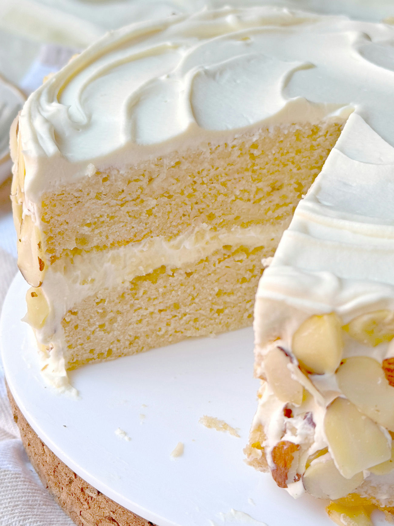 A tender, buttery cake infused with almond and vanilla, layered with a luxurious white chocolate frosting and finished with a delicate almond garnish.