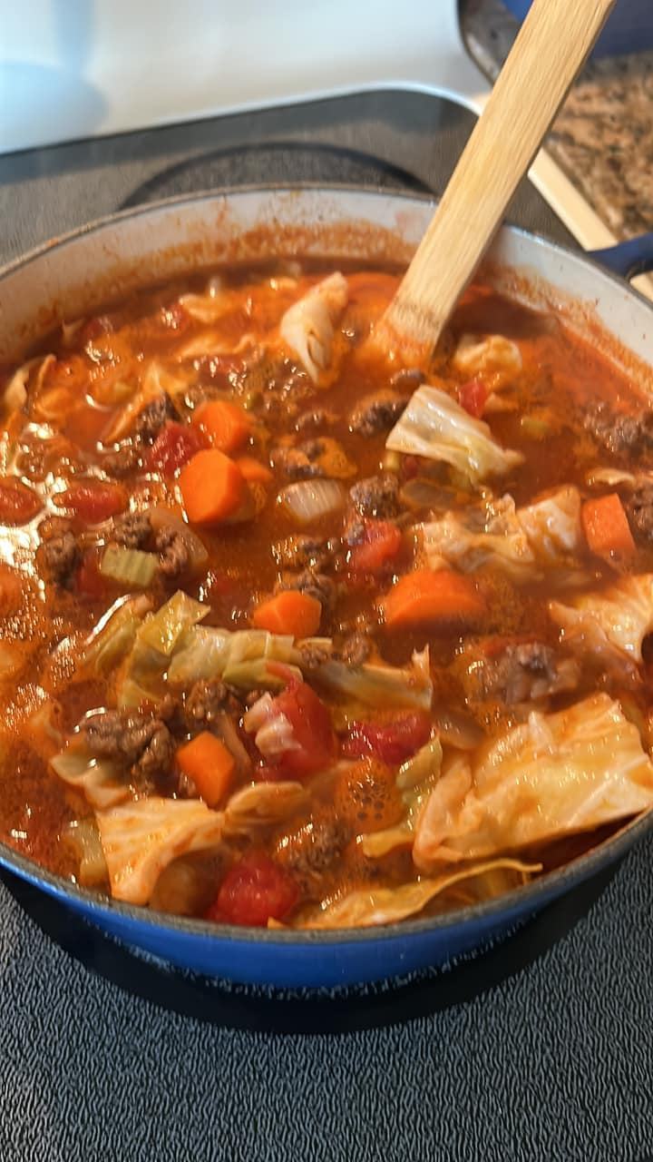 This hearty Cabbage Soup tastes like Cabbage Rolls but it’s easier and so comforting. It’s loaded with ground beef, veggies, and cabbage in a hearty tomato broth.