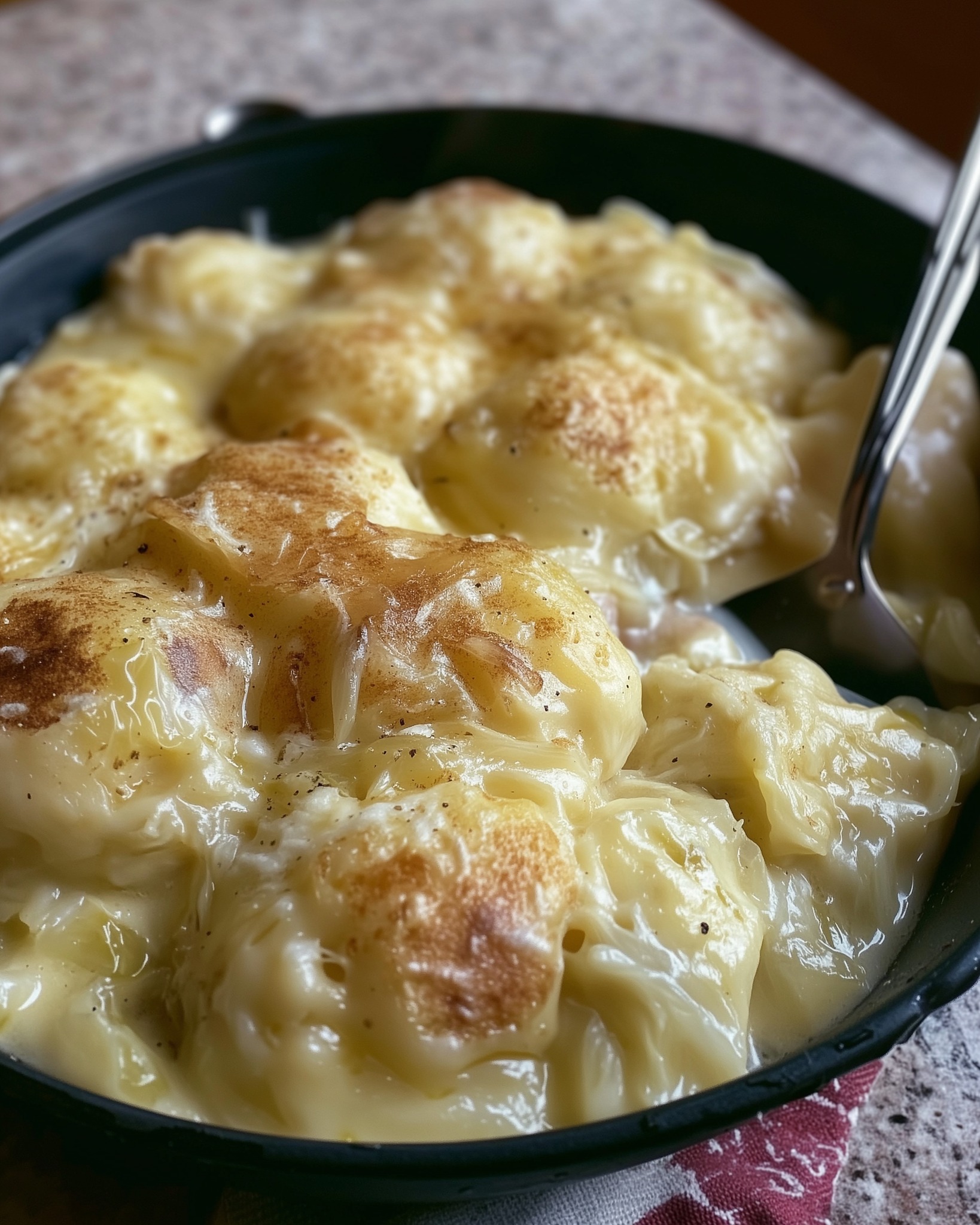 A comforting and classic one-pan meal that’s both hearty and satisfying. Tender, herb-flecked dumplings are nestled in a bed of sweet, buttery sautéed cabbage for the perfect simple supper.