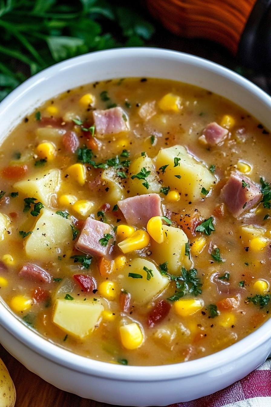 Embrace the ultimate comfort in a bowl! This rich and creamy chowder is loaded with tender red potatoes, sweet corn, and smoky ham, all swimming in a velvety, herb-infused broth. Topped with crispy bacon and fresh chives, it’s a hearty, family-friendly meal that turns a simple dinner into a cherished occasion.