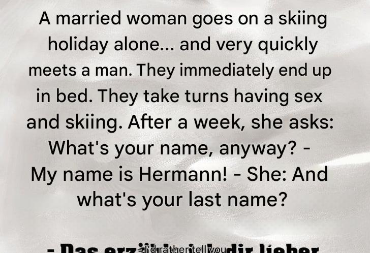 …and very quickly meets a man. They immediately end up in bed. They take turns having sex and skiing. After a week, she asks: “What’s your name, anyway?” –